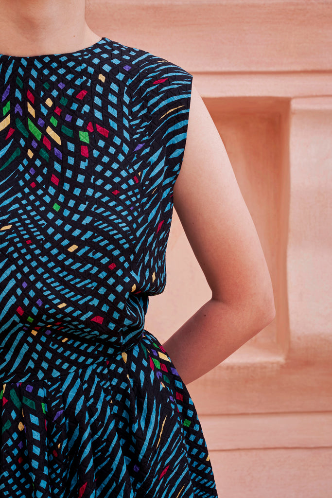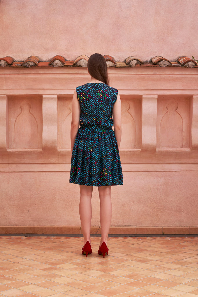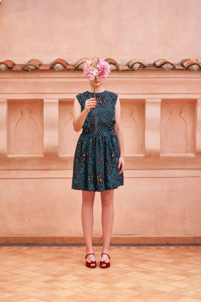 A short dress in an iconic vintage pattern by Gianni Versace from Caterina Gatta private archive.