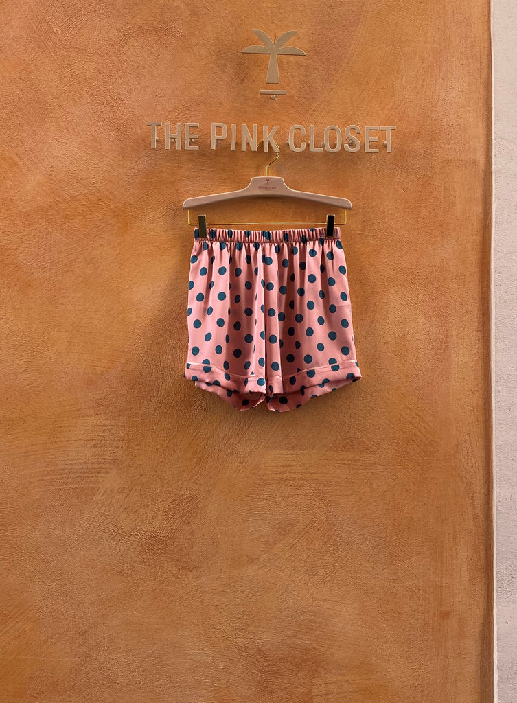 Appropriate for brunches, dinners and parties alike, Pink Dreams Dots Shorts are made from lustrous silk-satin in green polka-dots designed exclusively x The Pink Closet.