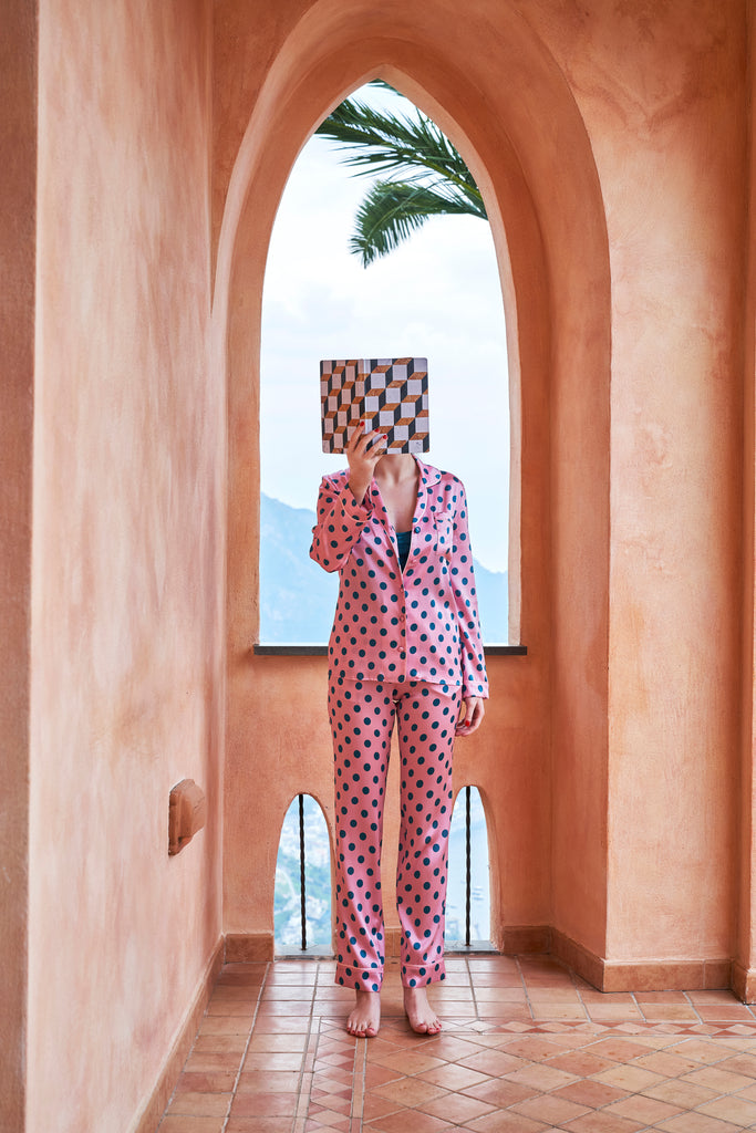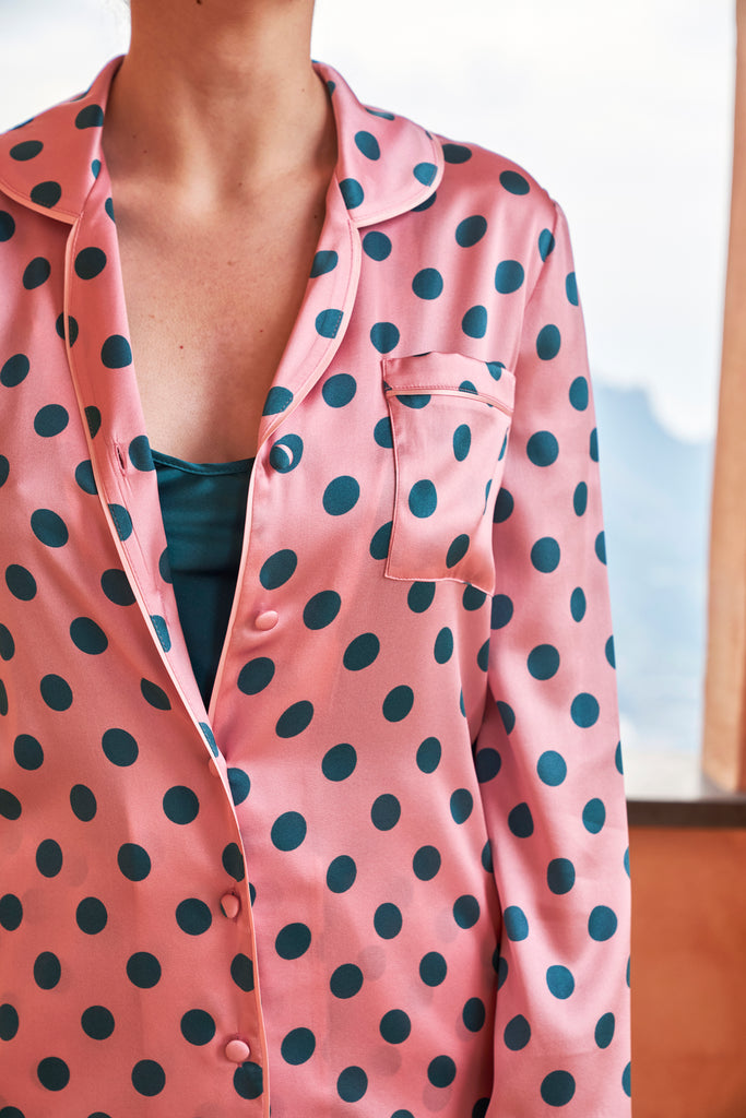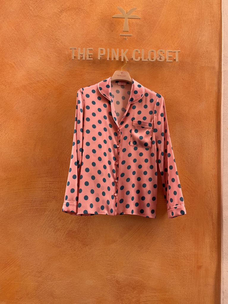 Appropriate for brunches, dinners and parties alike, Pink Dreams Dot Shirt is made from lustrous silk-satin in pink and green polka-dots designed exclusively x The Pink Closet.