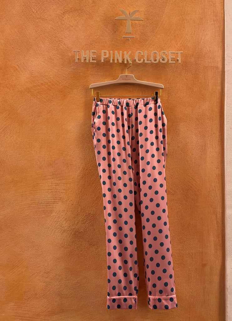 Appropriate for brunches, dinners and parties alike, Pink Dreams Dot Long pants is made from lustrous silk-satin in pink and green polka-dots designed exclusively x The Pink Closet.