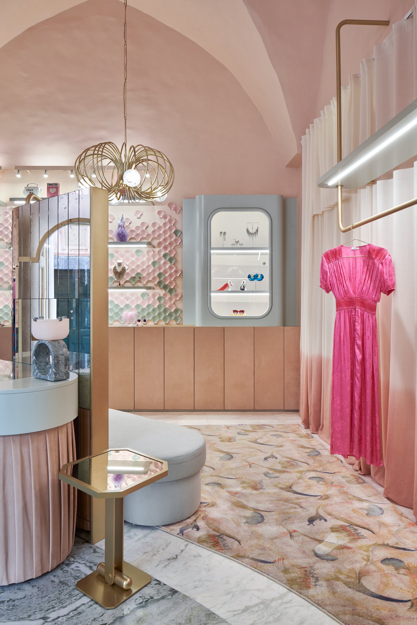 The Pink Closet is a laboratory of what is beautiful and unique, a territory where one can discover the unexpected, the unusual, the unobtainable. The environment enhances the content. playfulness and joy guide the path of discover. Entering The Pink Closet is like starting an amazing treasure hunt inside a contemporary grotto with the walls of ceramic shells and the floor inlaid like a seabed. Transparent and reflective surfaces of antiqued mirrors recall the surface of the sae, while little windows and small seats open all around and the dressing room is a soft and muffled ambiance covered in decorated carpet. Lamps inspired by jewelry and a rotating mirror with incorporated visor enhance the sense of magical surreality. The Pink Closet is a dream, made real. It follows a logic of its own, made of beauty as pure emotion.